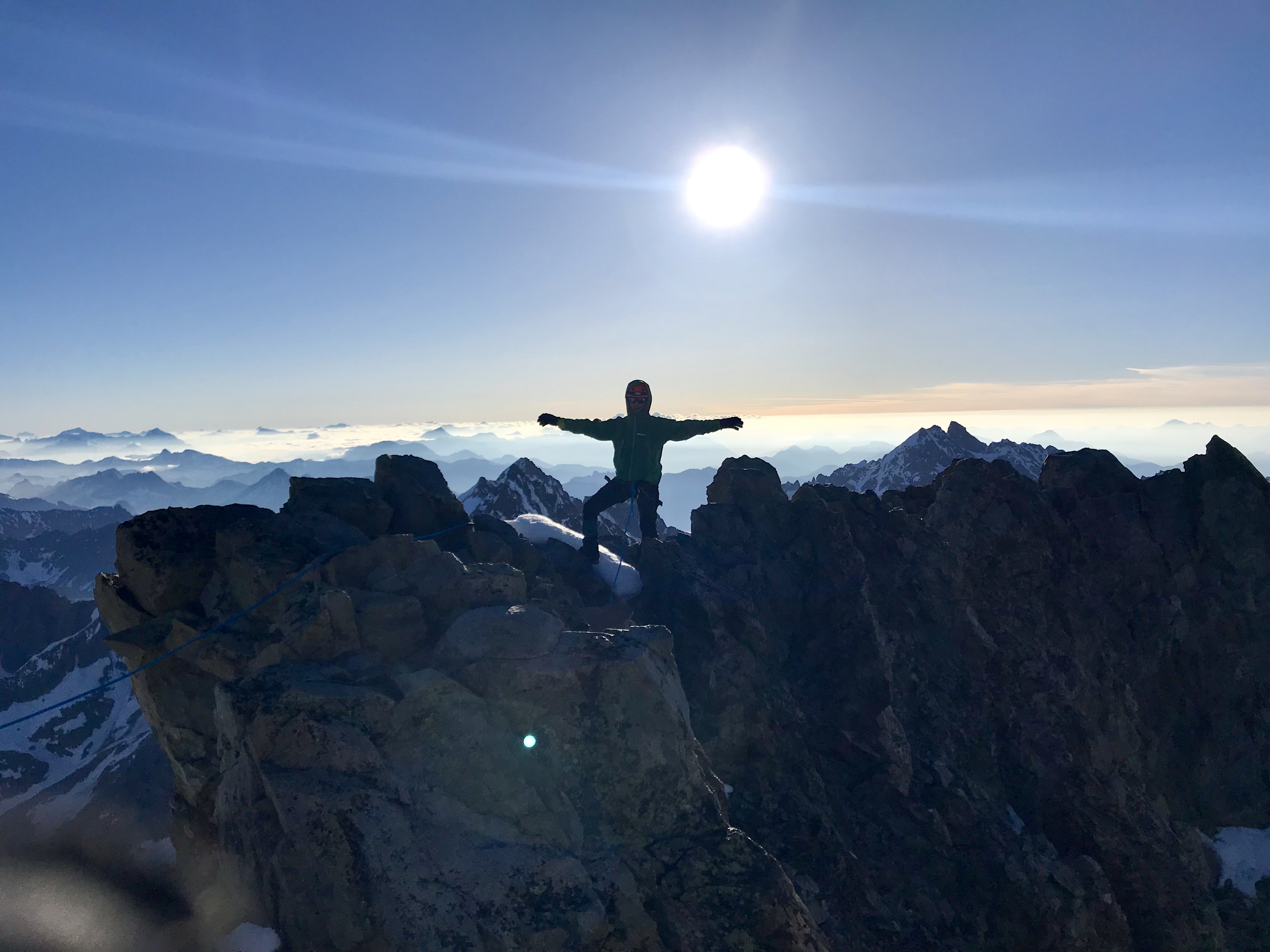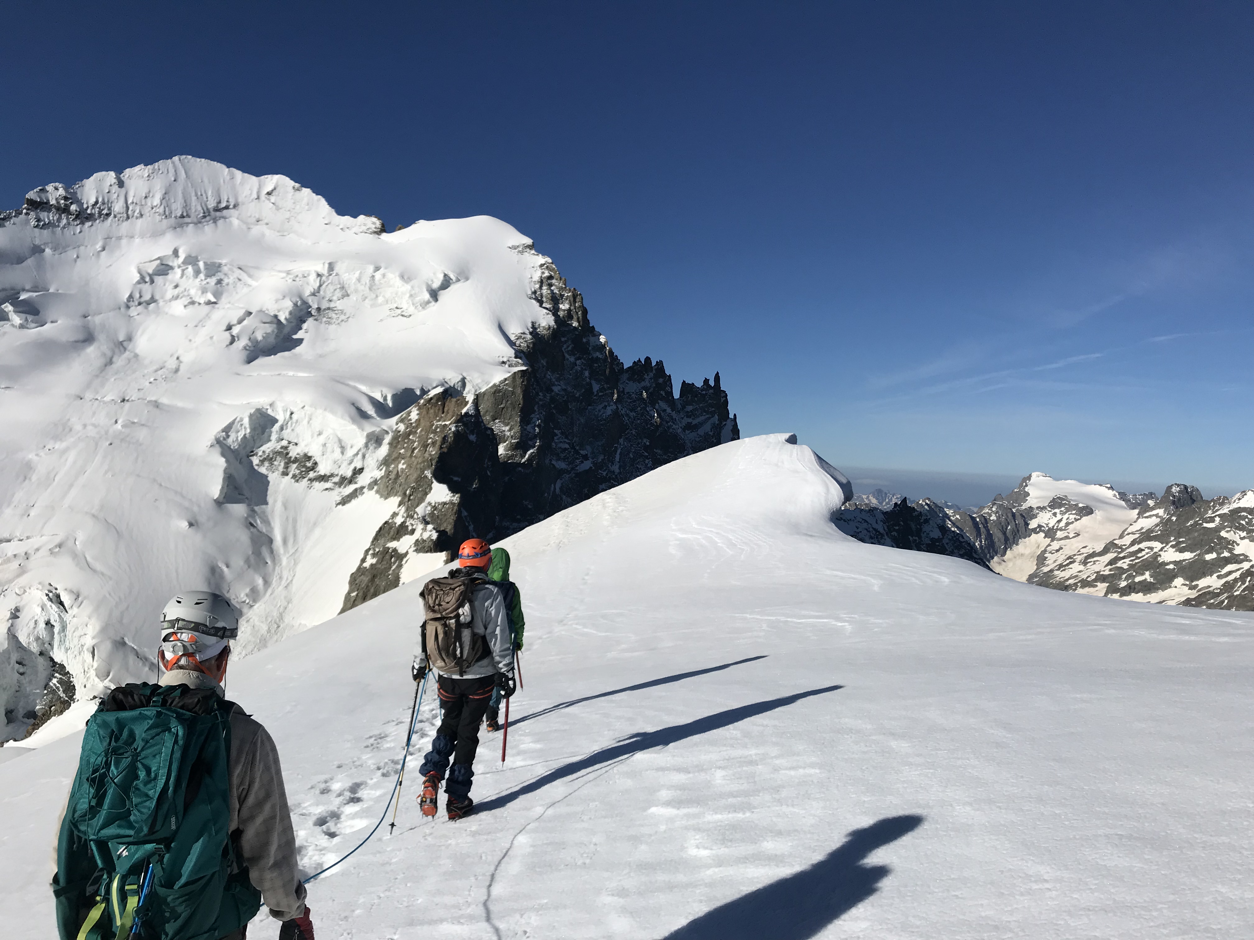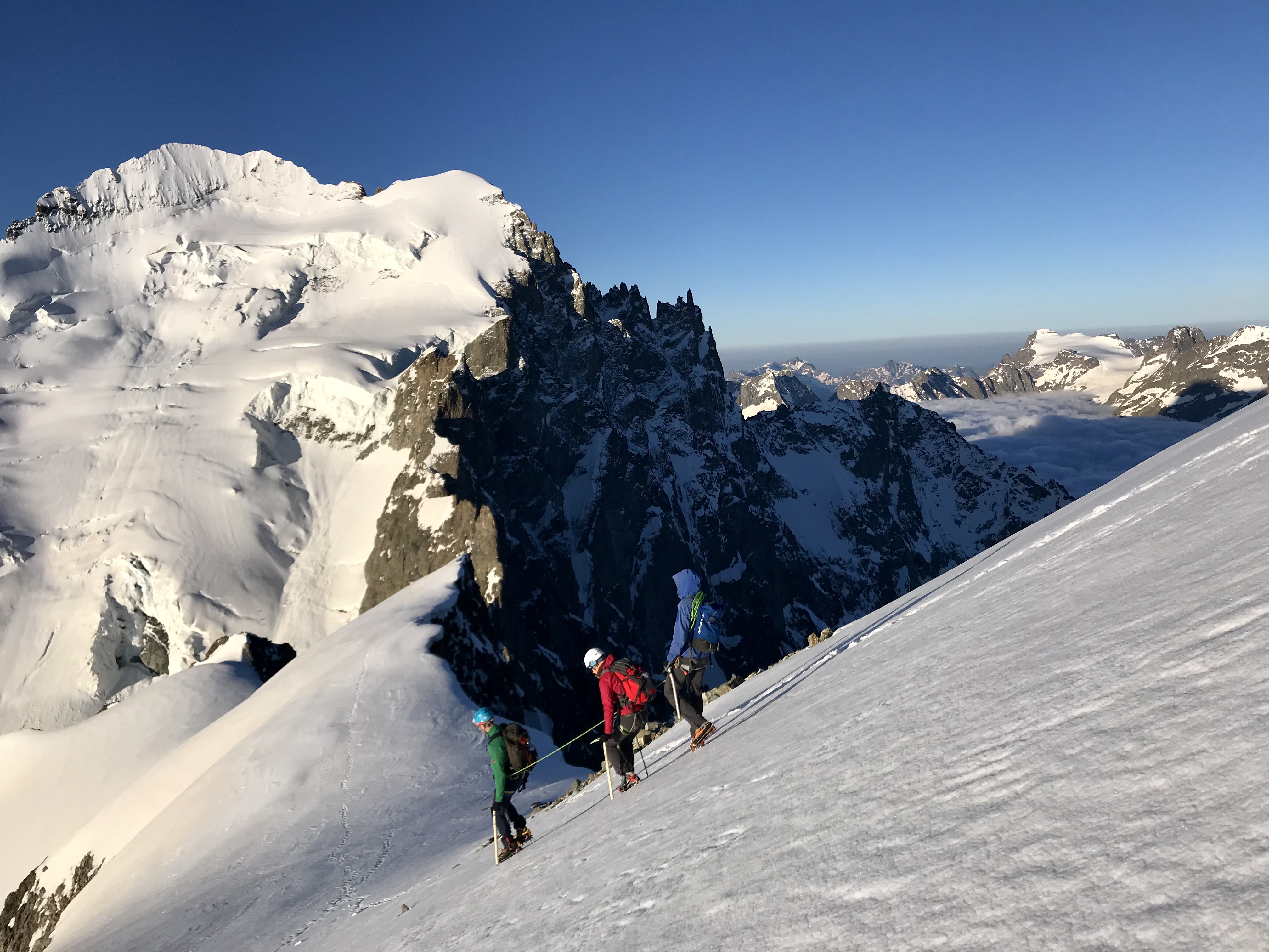 Avec Anne, Xavier et Alain nous montons tranquillement devant le spectacle de la barre des Ecrins. Seul Xavier grimpera le petit passage rocher donnant accès au sommet.