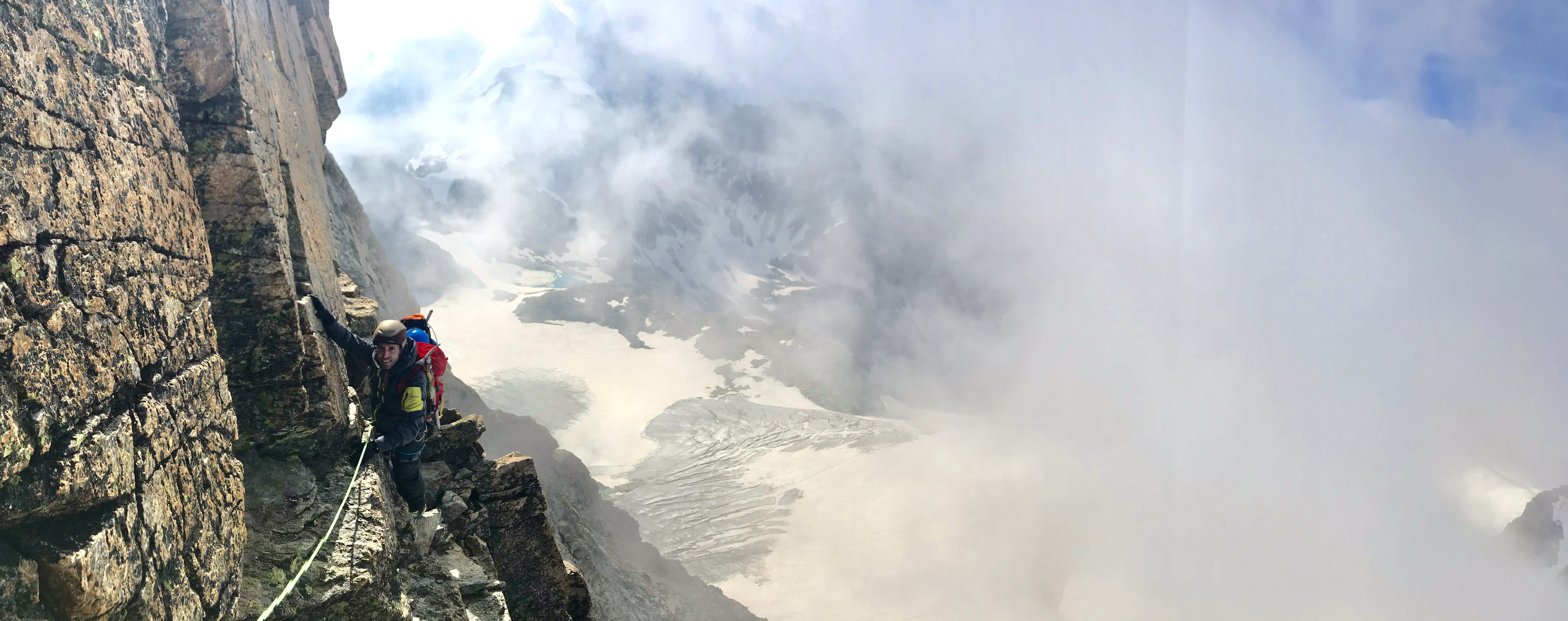 Reveil matinale pour le glacier, pas de regel on enfonce et on joue le dans les flaques d’eau. Le brouillard ne nous lache pas, on commence à grimper et le ciel se déchire enfin.