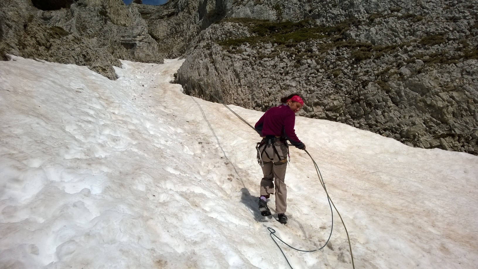 La descente, sans crampon, dans le couloir des tubulaires se passent bien malgré la neige encore bien présente.