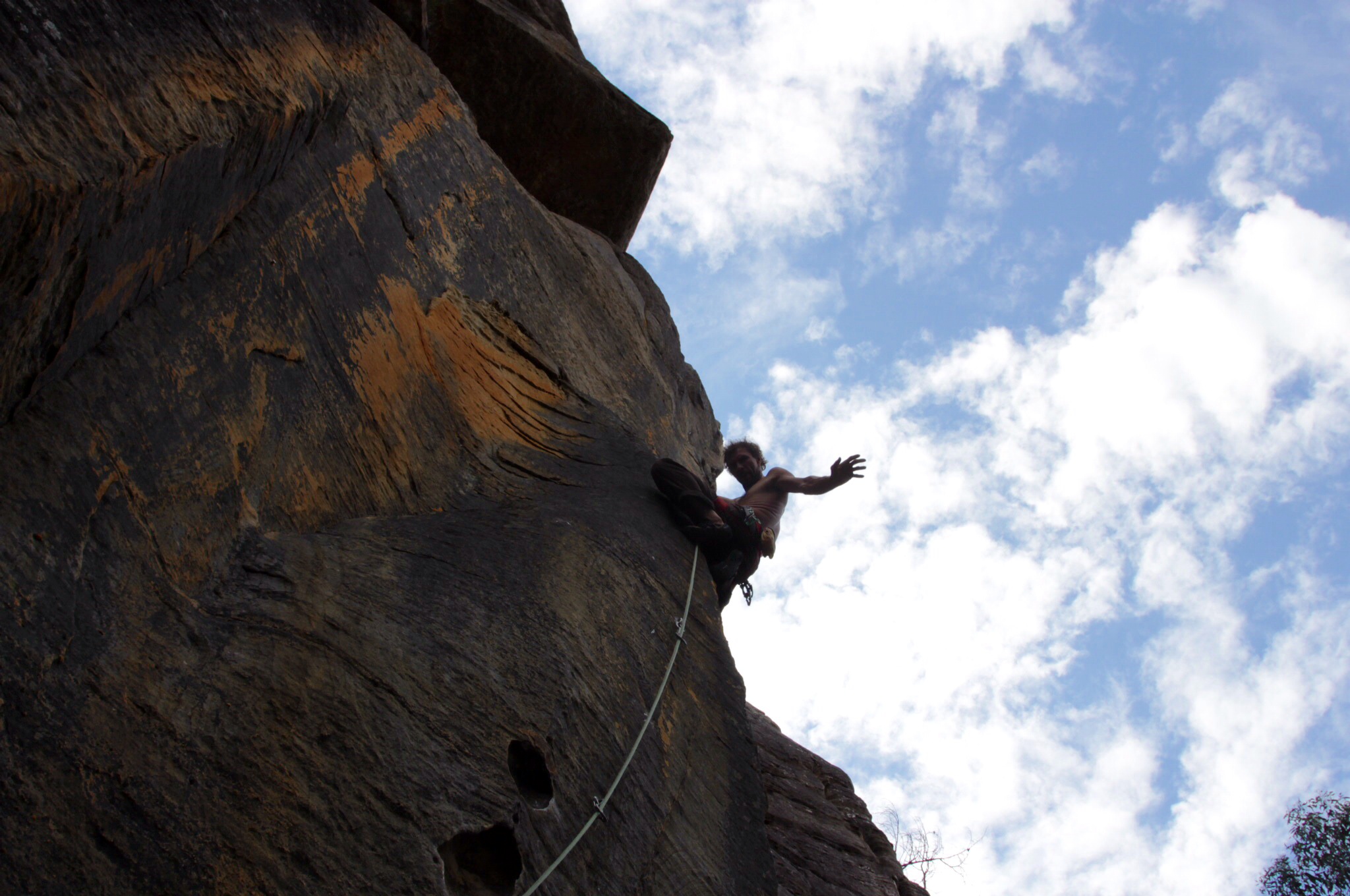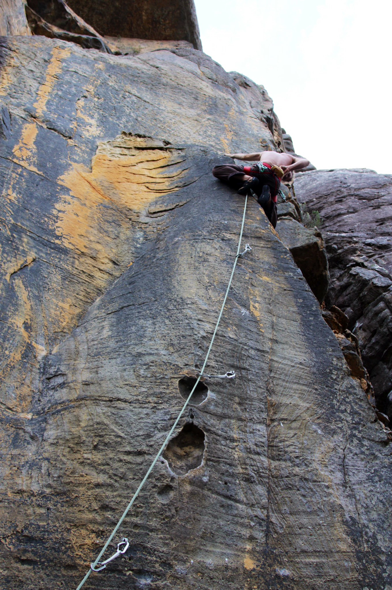 Le début de la voie est sympa, de grosses prises, effrayantes tellement elles sont fines et tranchantes, le tout avec des protections faciles à placer.