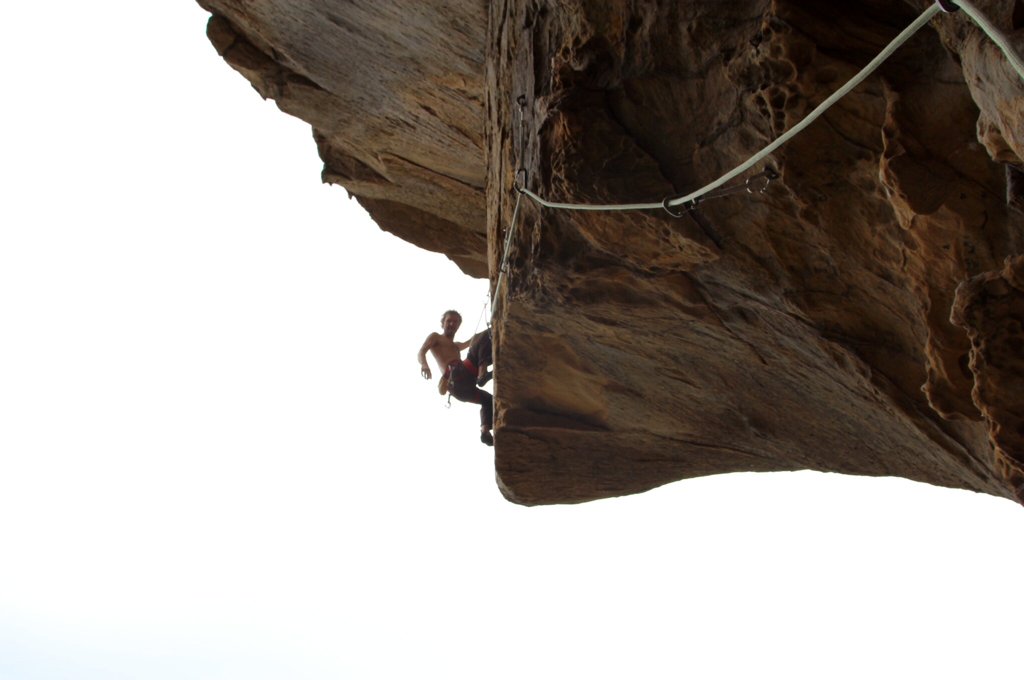 Arrivé à la falaise mon choix se porte sur une voie en 18 (équivalent à un 5B) rien d’extraordinaire jusque-là. La voie remonte un mur raide sur 40m puis coupe un toit avec une avancée de 5m pour finir 10m plus haut sur le plateau.