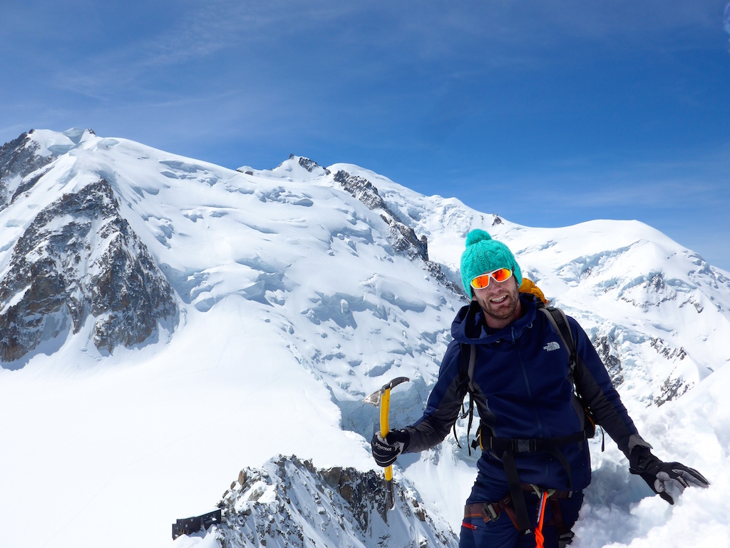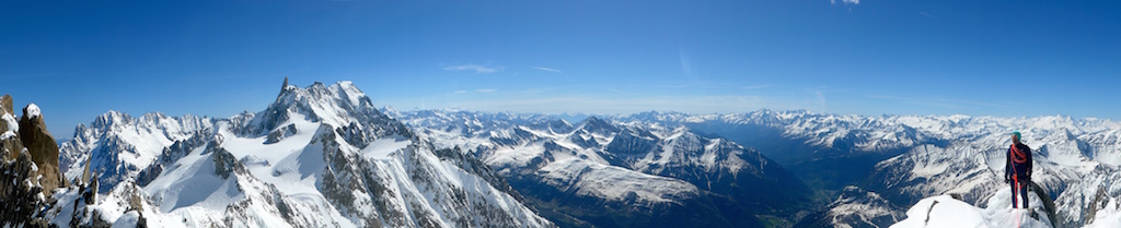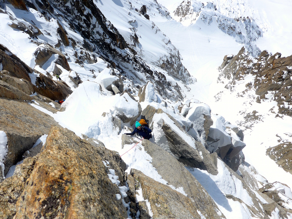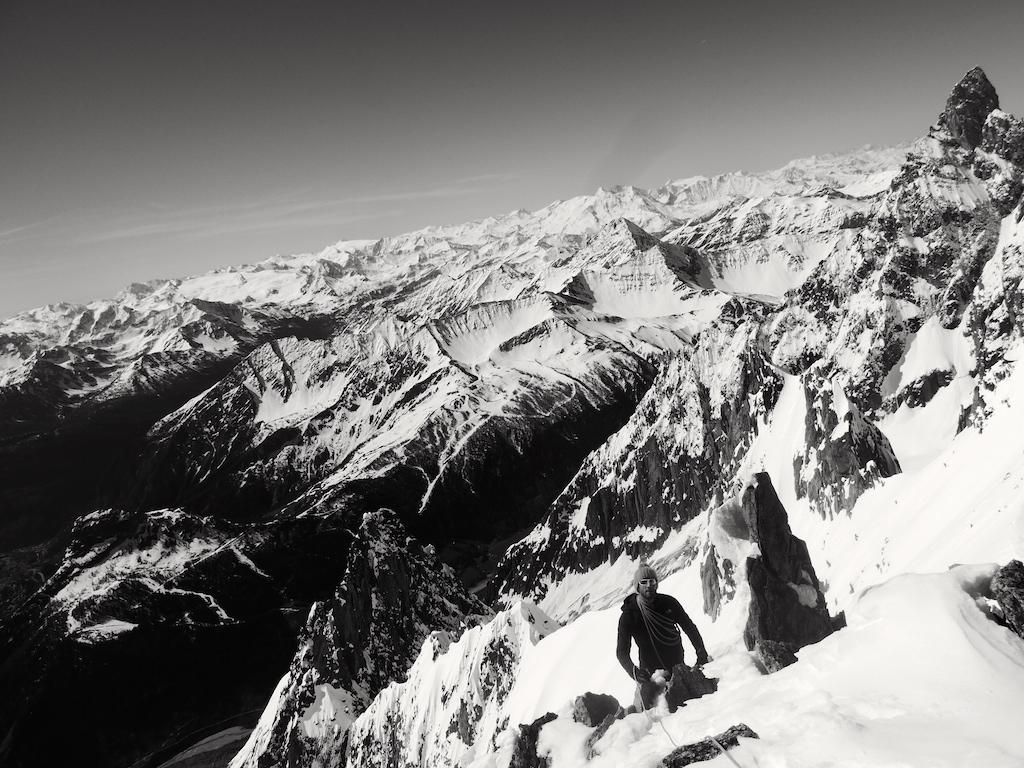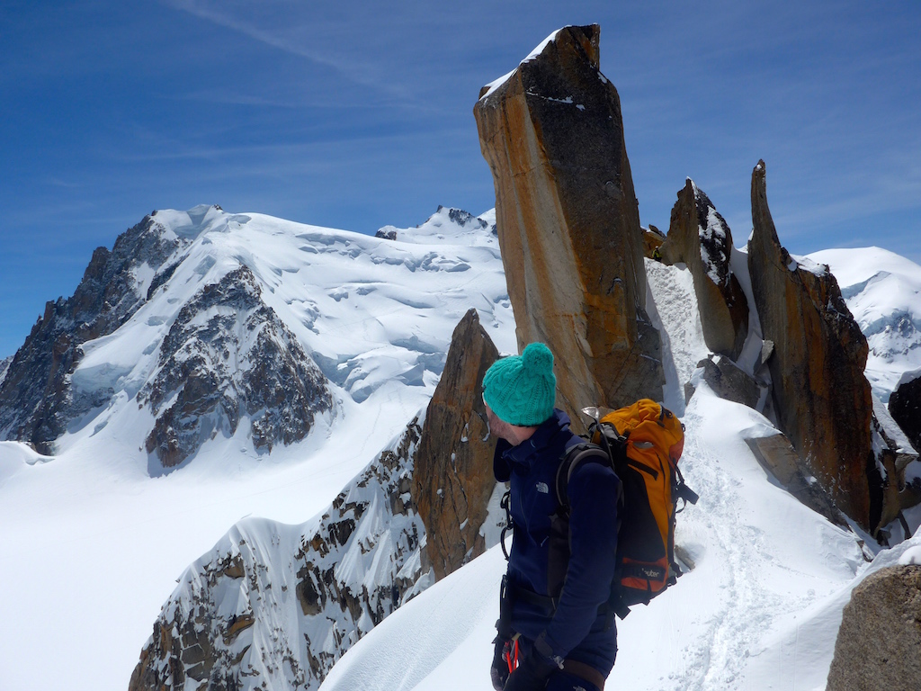 La neige est encore là, …. changement de programme, après une location de skis de rando, nous voilà sur l Aiguille du Midi, lourdement chargés, nous glissons jusqu’au refuge des Cosmiques pour y laisser nos skis et enfiler tel un chat l Aiguille par l’arête des Cosmiques.