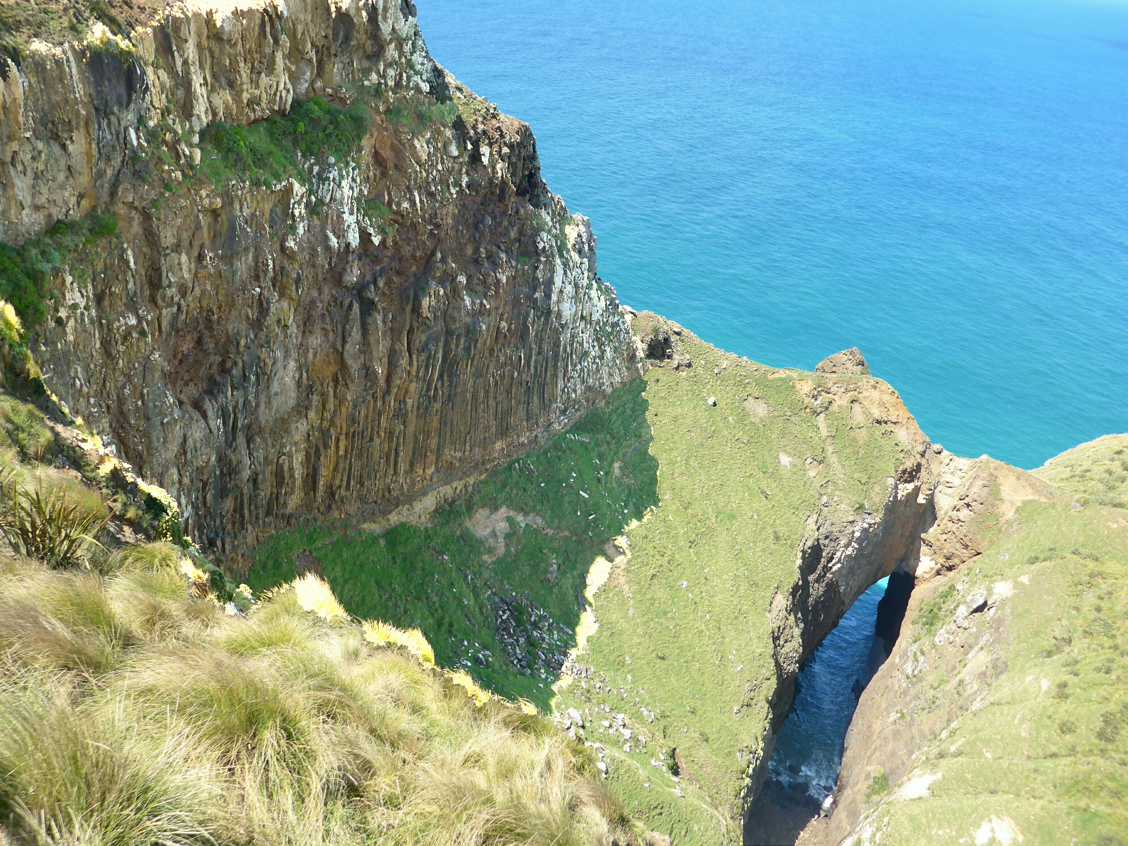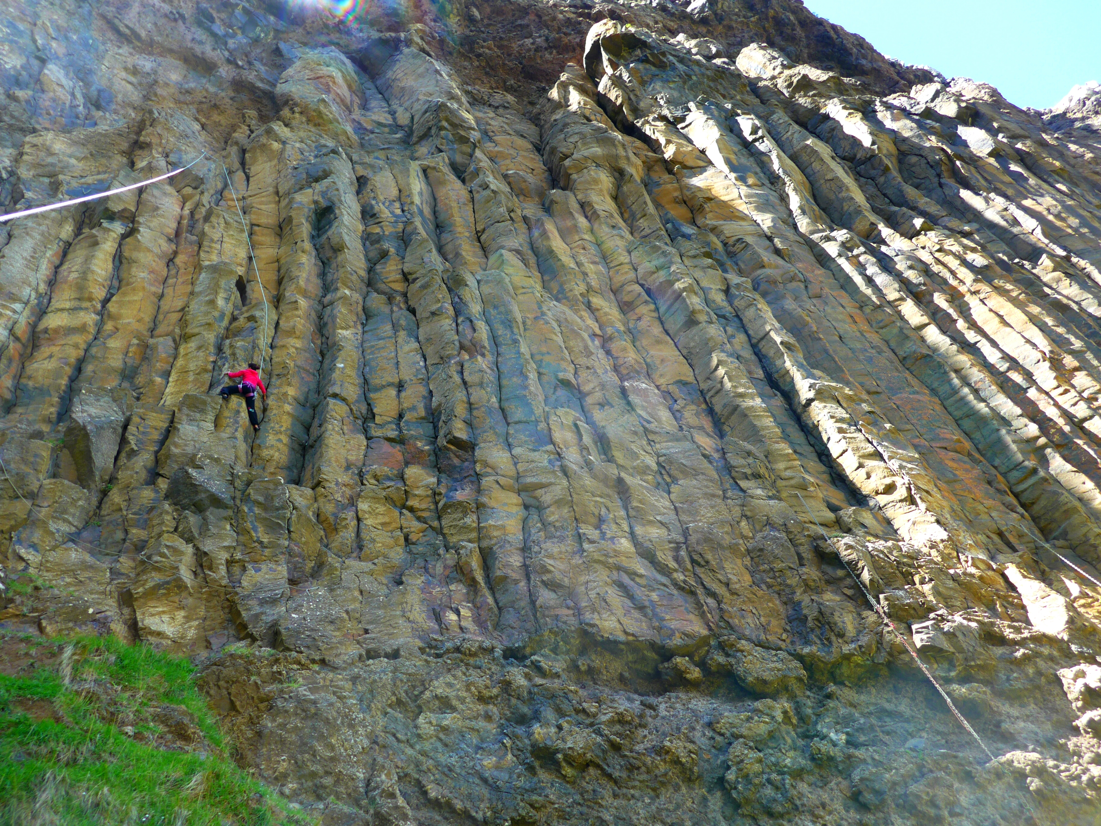 Le descente, sur une arête mi rocher mi herbe, commence directement à pic. La prairie, si on peut appeler ça une prairie, domine une falaise au dessus du grand bleu. L’ambiance est au rendez vous. Où ai je mis mes crampons? Petite desescalade de touffes d’herbe en touffes d’herbe, nous voilà à pied d’œuvre.