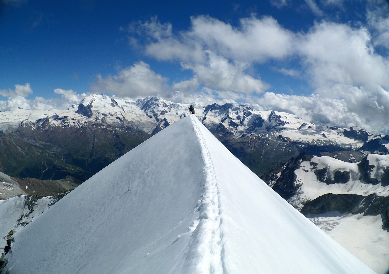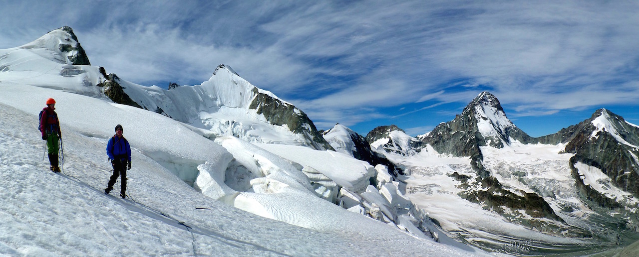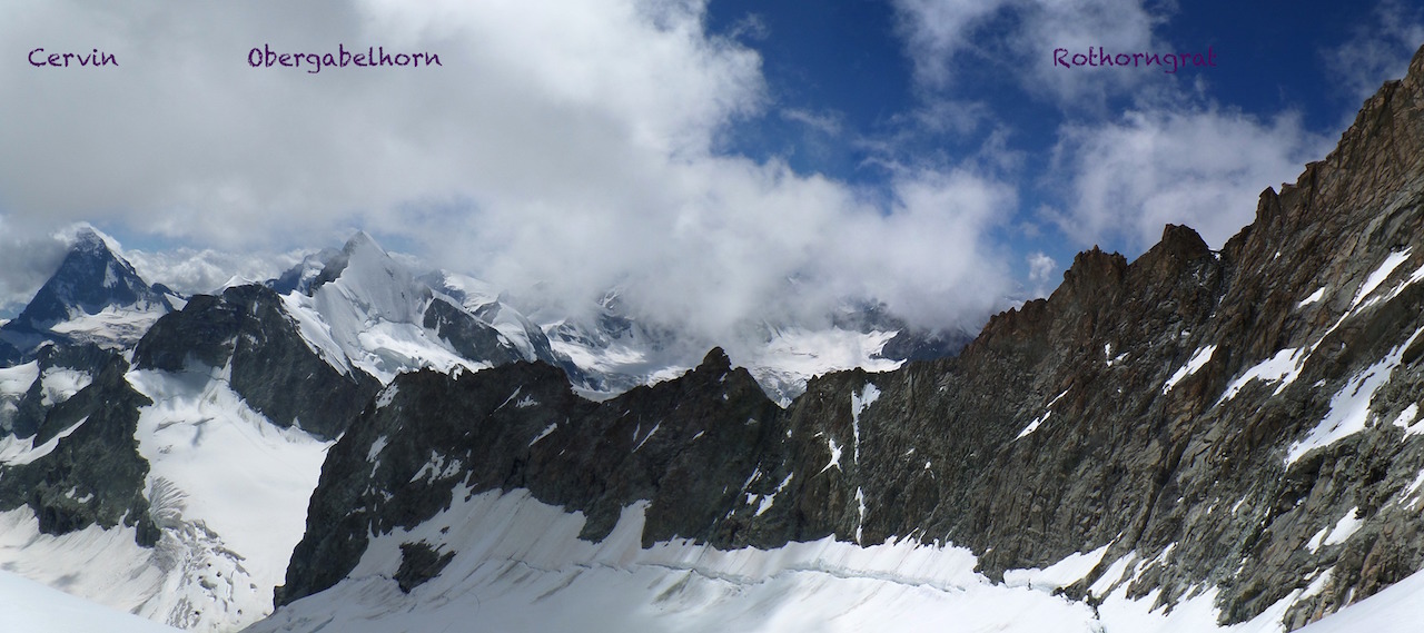 Le glacier passe tout seul, puis vient le couloir, 2 broches plus loin on est sur la rothorngrat. On avance doucement… trop doucement, le trajet, la non acclimatation, le temps de trouver les repère en escalade sur le rocher en grosse, bref on passe au plan B.