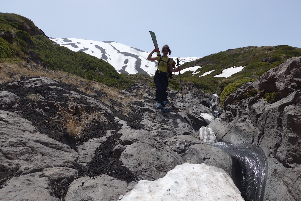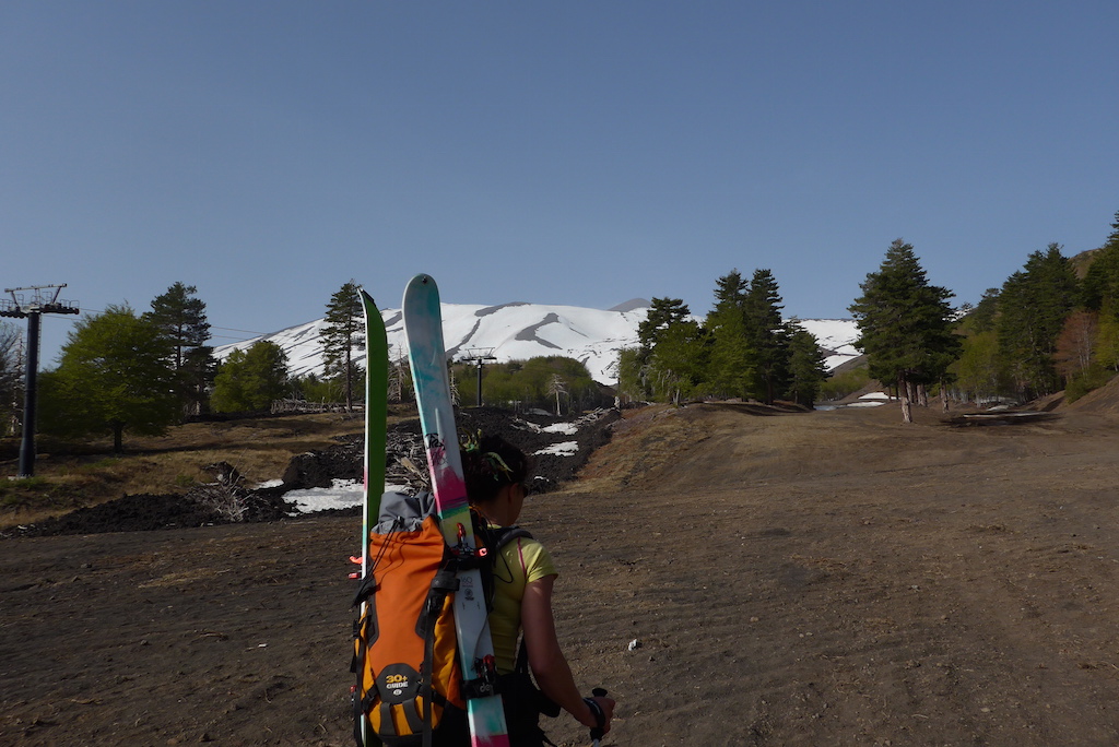 Un slalom entre les bandes de laves séchées nous permet d’arriver enfin au cratère NE le plus haut des 4 cratères de l’Etna. Une visite des trouloulous et un pic nic sur les pierres chaudes du sommet. L’heure est à la descende par un petit couloir. Une traversée dans la pampa locale pour revenir à la voiture et enfin la bière au soleil.