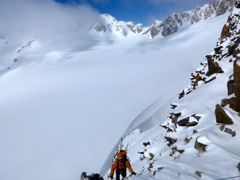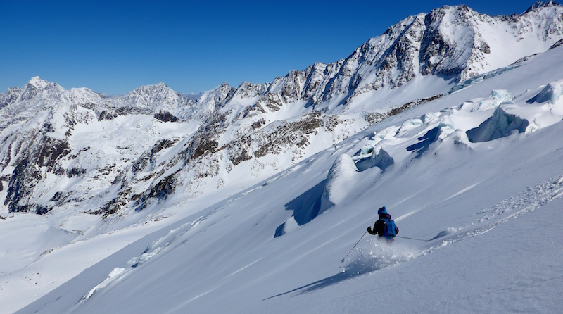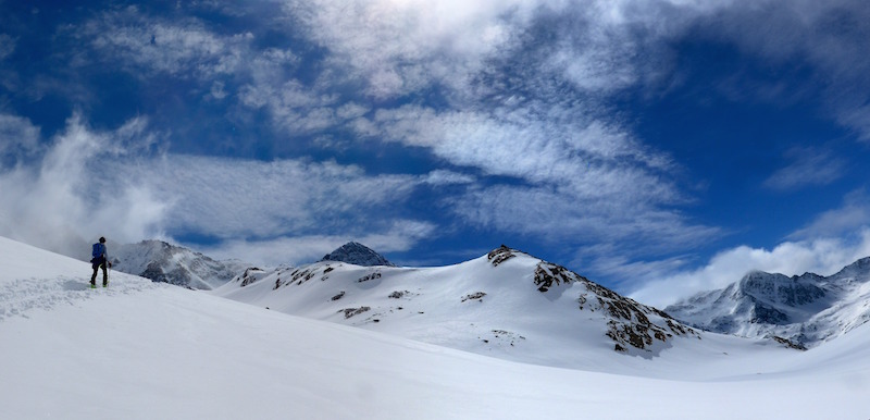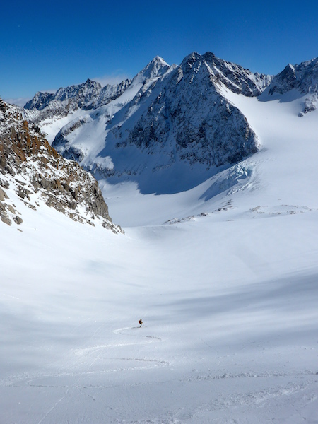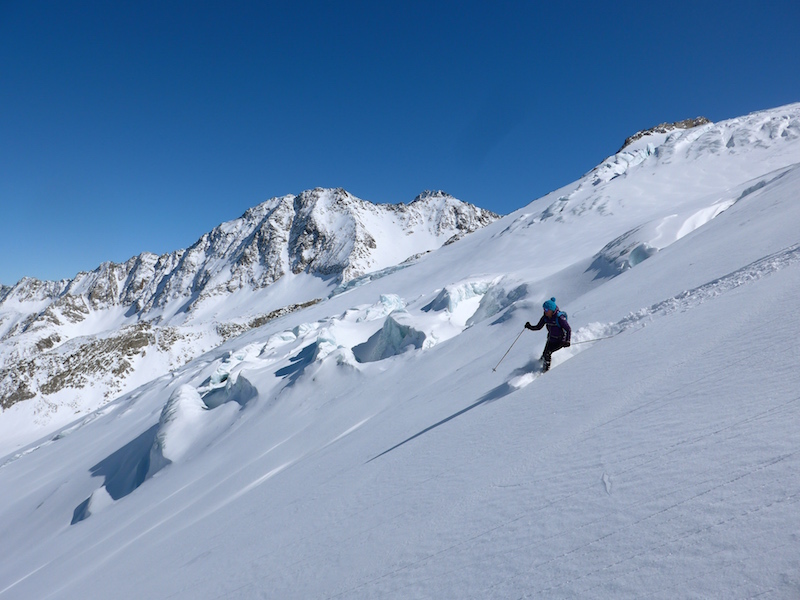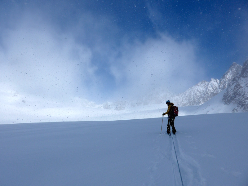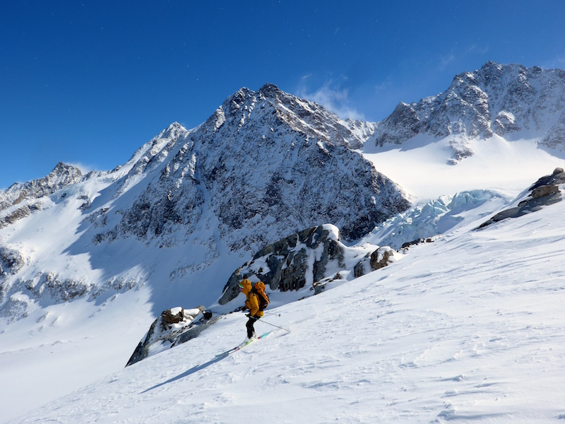 Les jours de soleil et de passage nuageux joue avec les passages techniques des petits cols et des descendes en poudreuse sur les glaciers froids.