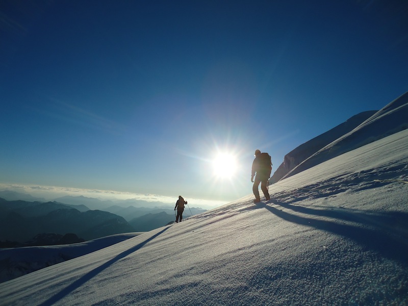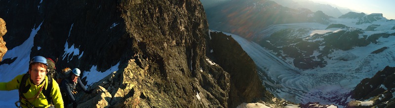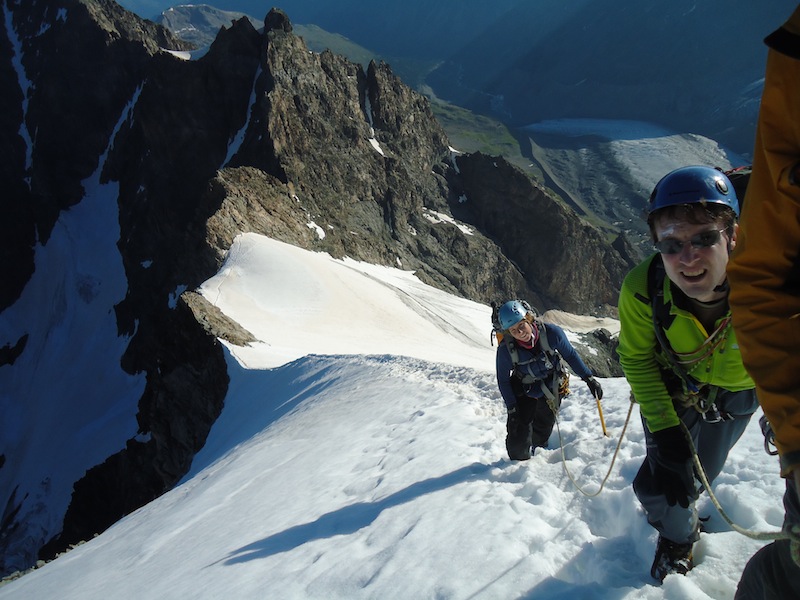 On descend par l’arête ouest, petite désescalade, un rappel avec la corde explosé et puis une jolie glissade sur la dernière pente de neige… On a tous revu en une journée.
