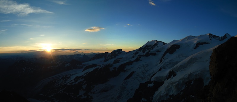 3h30 plus tard, une désescalade, un peu de moulinage et deux longs glaciers a couper, la chamana Tschierva.